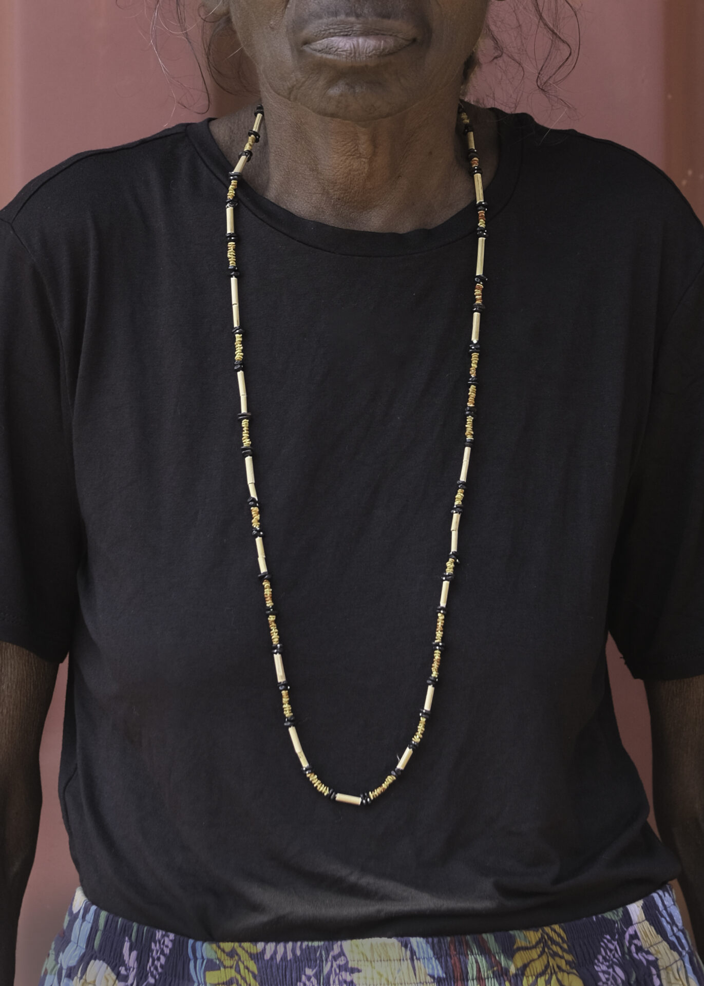 Manimani (body adornment) has a long history in Yolngu culture. Items made from locally collected materials including native grass, seeds, nuts, shells and plant fibres are worn for ceremony or simply for every day use – in the words of artist Ruth Nalmarkarra “to make us pretty.”